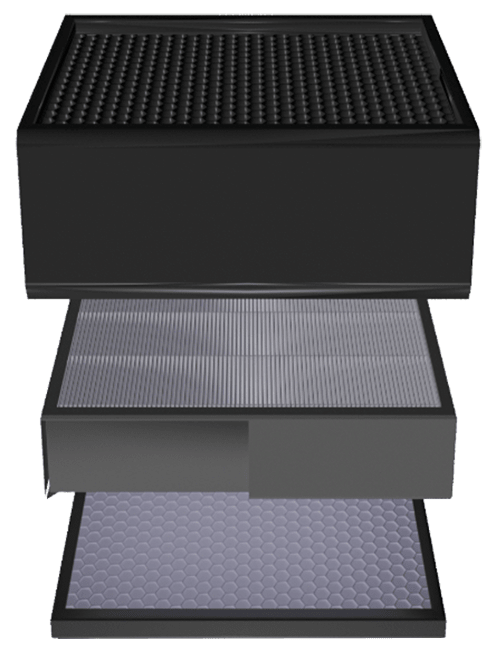 ATバリアLiteは、プレフィルター・HEPAフィルター・ケミカルフィルターによるフィルタリングシステムを採用。